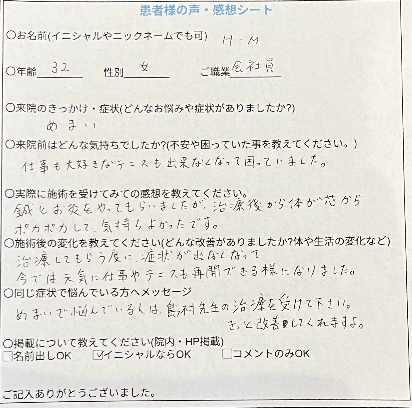 治療してもらう度に症状が出なくなって、今では元気に仕事やテニスも再開できる様になりました。