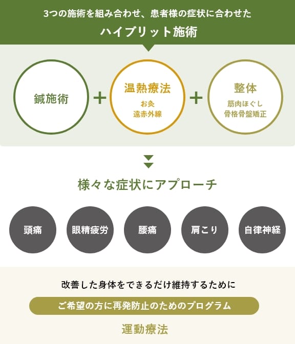 ラディカルケア鍼灸院では「鍼施術」「温熱療法」「整体」を組み合わせたハイブリット施術を行います。患者様一人ひとりの症状やお身体の状態に合わせたオーダーメイド施術により、体の深部から整え、根本治療を目指します。ご希望により改善した身体をできるだけ維持するために「運動療法」も取り入れております。